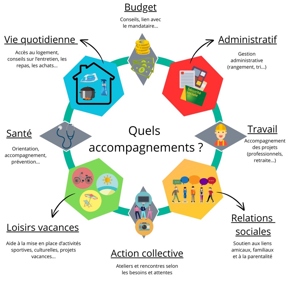 Accompagnement au domicile de la personne, dans les locaux du service ou dans la Cité.